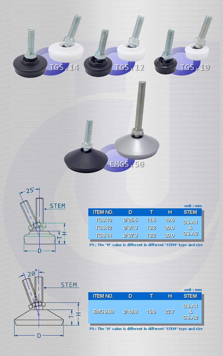 Product Name:Adjusting Glide Country of Origin:Taiwan Model:TGS & EMGS Material:High Density Polyethylene Color:Black or White Detail Specifications TGS : Material:High Density Polyethylene , Color:Black or White. EMGS : Material:Nylon , Color:Black or Coating Gray. Find "STEM" in Specification Image and Product Categories for available stem