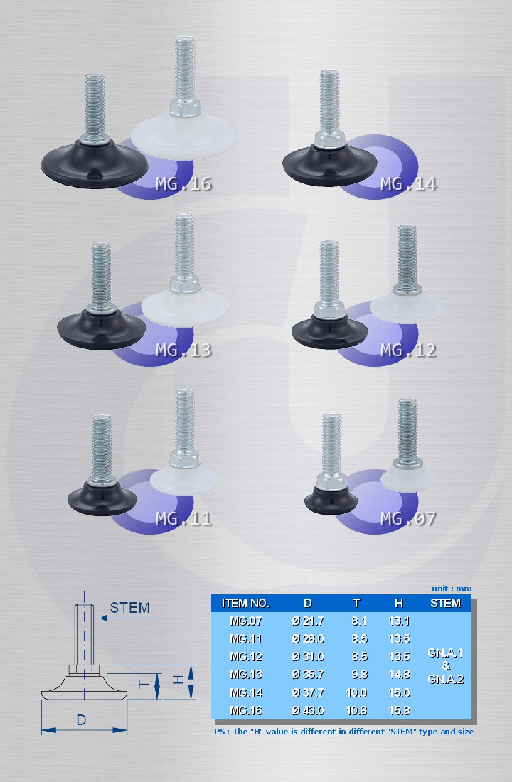 Product Name:Adjusting Glide Country of Origin:Taiwan Model:MG Material:Nylon or HDPE Color:Black or White Detail Specifications Black Base Material : Nylon. White Base Material : HDPE. Find "STEM" in Specification Image and Product Categories for available stem